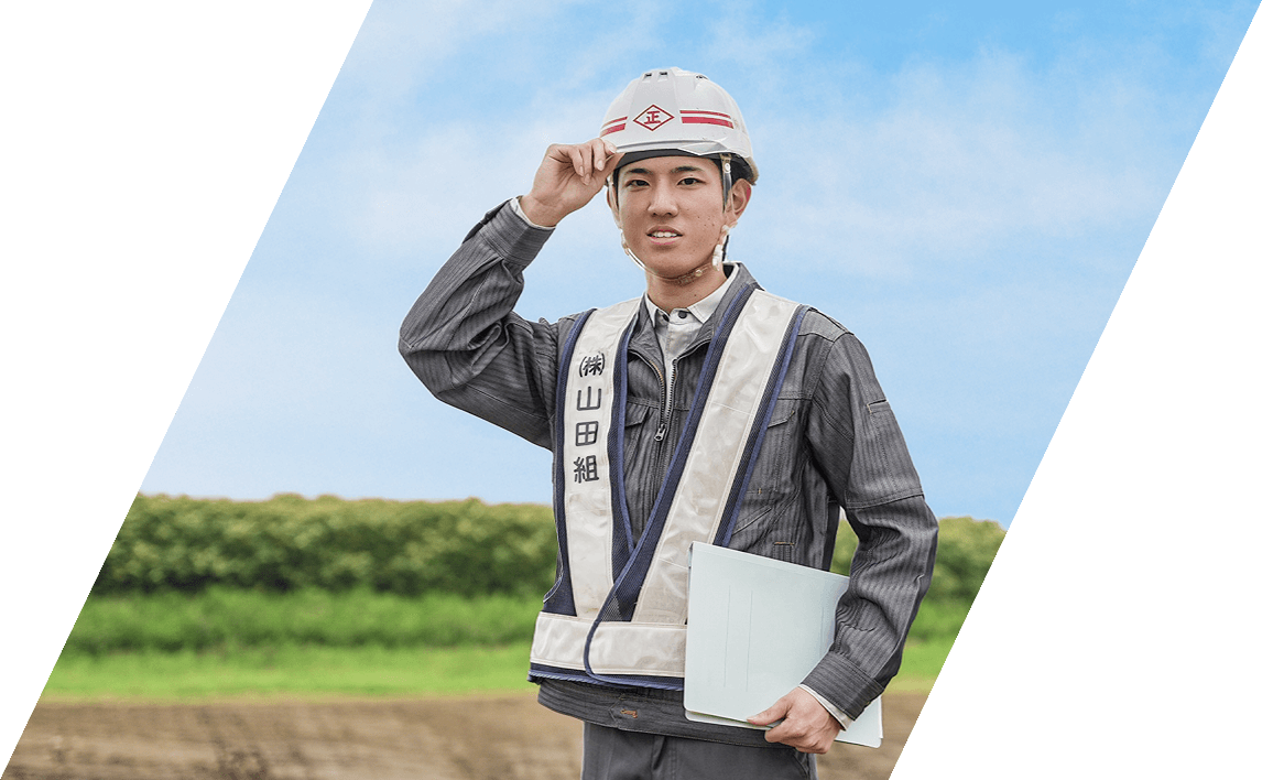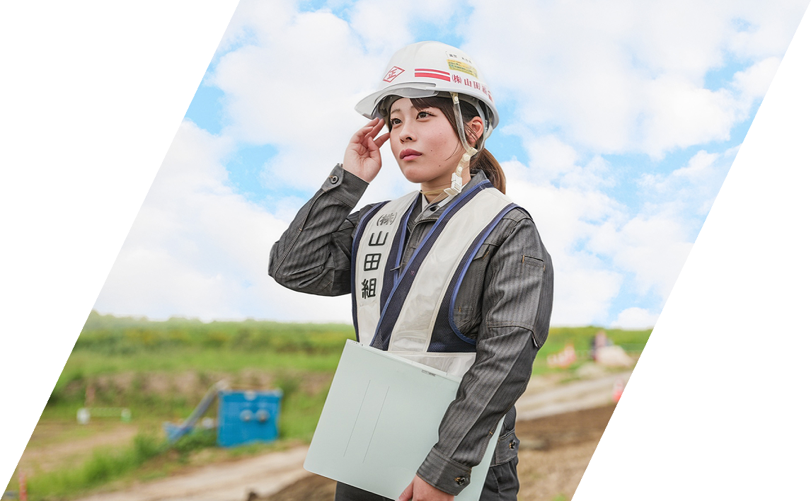 私は⾼校で⼟⽊を学び、卒業後は学校で⾝につけた知識や技術を⽣かしたいと考え、⼭⽥組に就職しました。⼊社後は、学校と仕事では全くの別物でわからないことがたくさんありましたが、先輩⽅が優しく教えてくださり、少しづつできることが増えてきました。年齢の近い先輩⽅も多く、仕事の合間などにいろいろな話をし、時に笑い合いながら、今では楽しく仕事をすることができています。 今後は、現場に携わり様々な経験をしながら理解を深めていき、⽇々成⻑できるよう努⼒していきます。