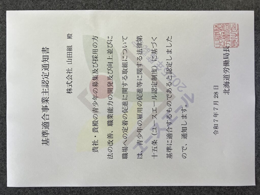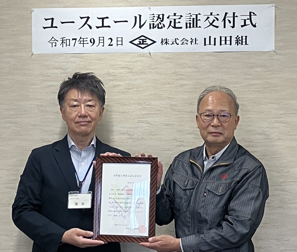 令和7年7月28日(月)、厚生労働省のユースエール企業に認定され、9月2日(火)山田組本社にて交付式が行われました。