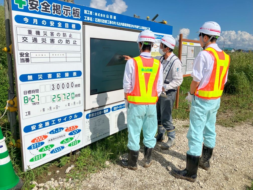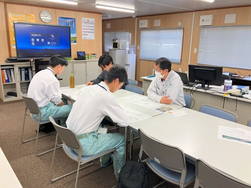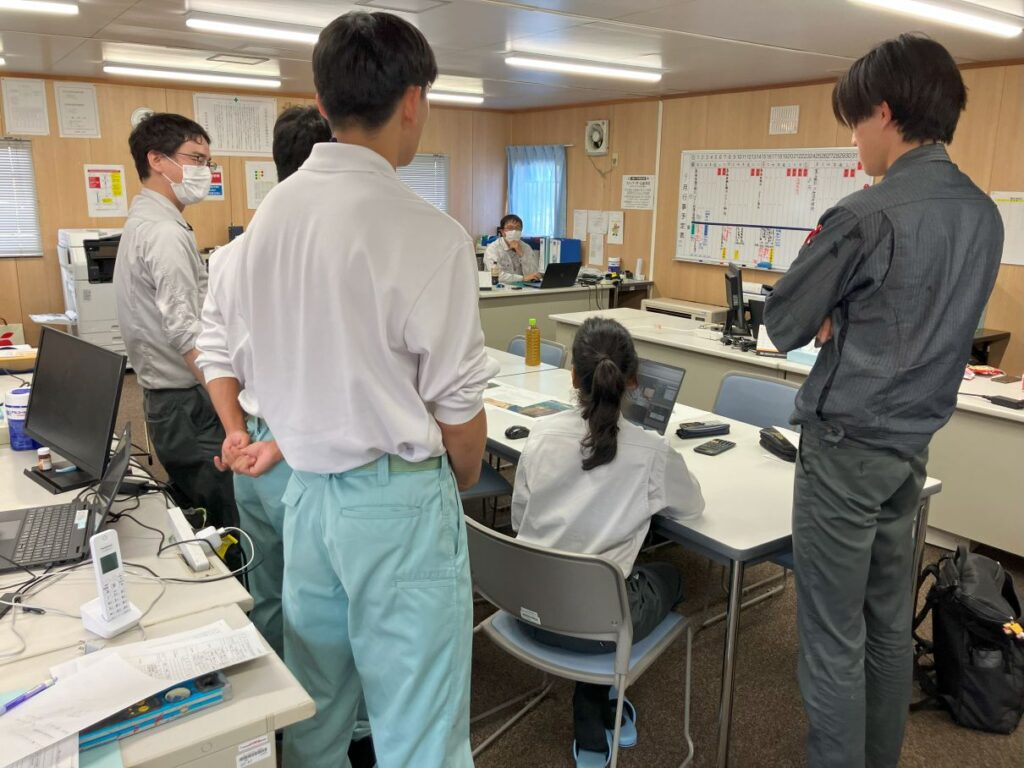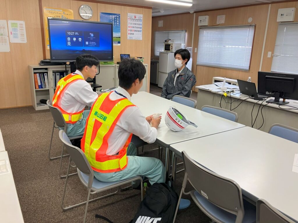 施工現場や札幌工業高等学校 土木科OBの働く姿を見ていただき、現場の雰囲気、安全管理の必要性、施工管理の仕事内容、ICTの活用等について学んでいただきました。