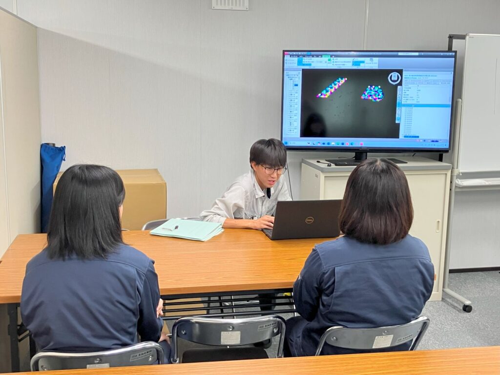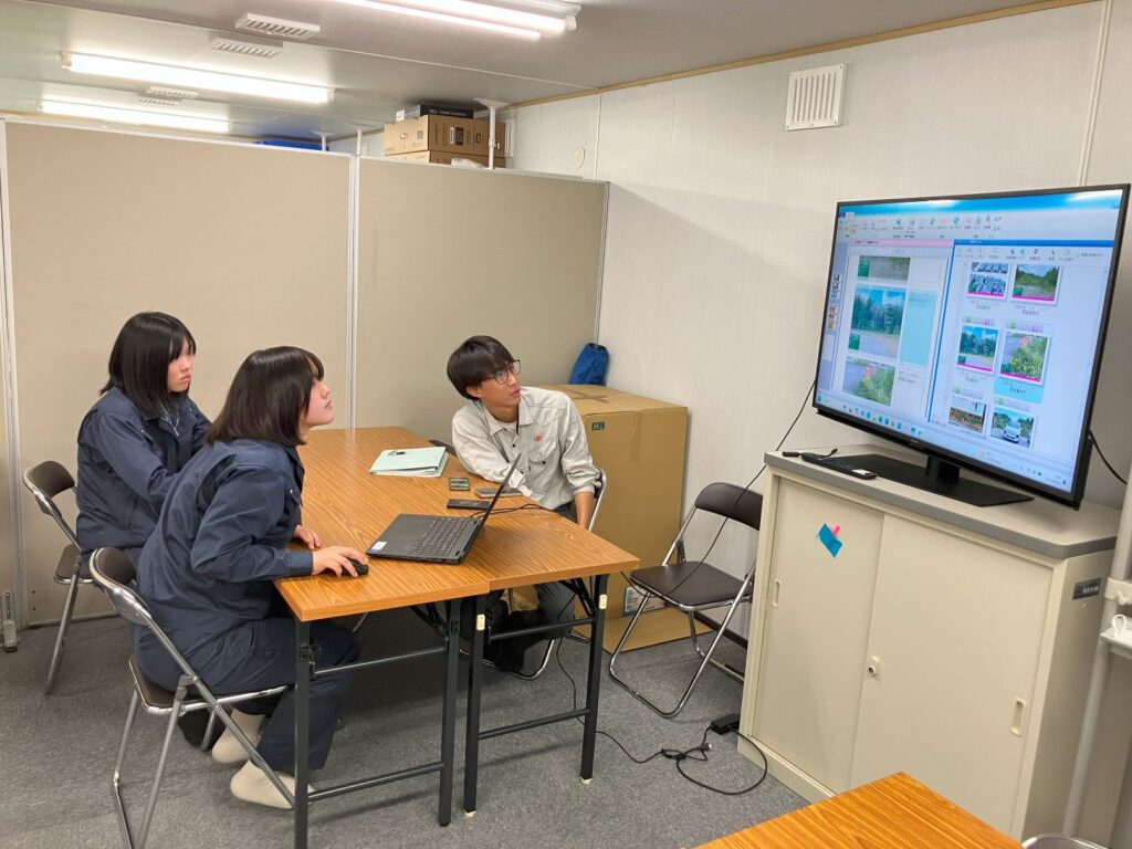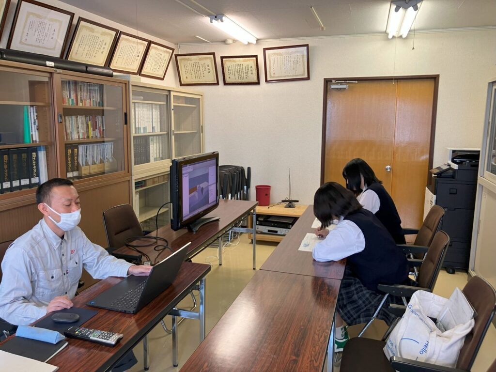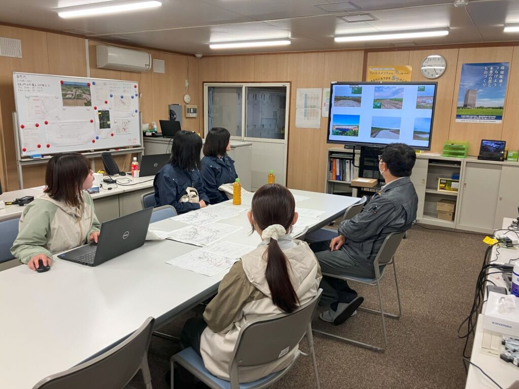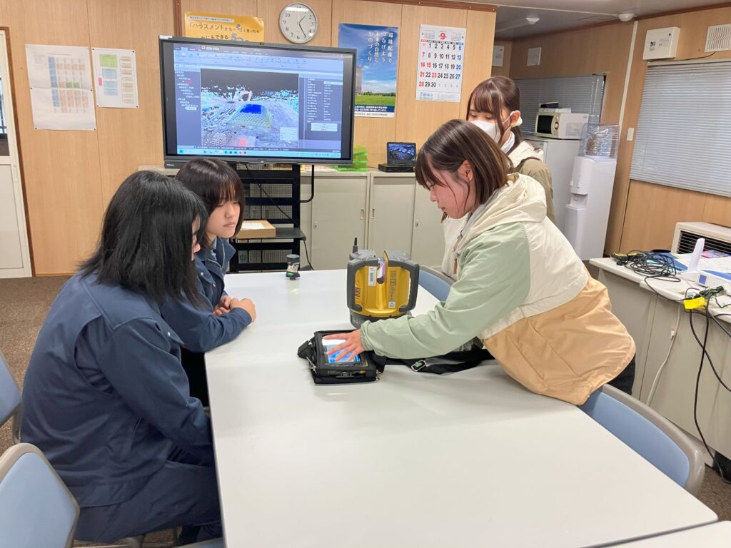 午後からは、屋外でレーザースキャナーを使用し測量実習を行う予定でしたが、天候不良のため、現場事務所内で、岩見沢農業高校出身の先輩が講師となり、レーザースキャナーでの測量や測量後の3Dデーター化して盛土の土量を算出する流れを丁寧に説明しました。